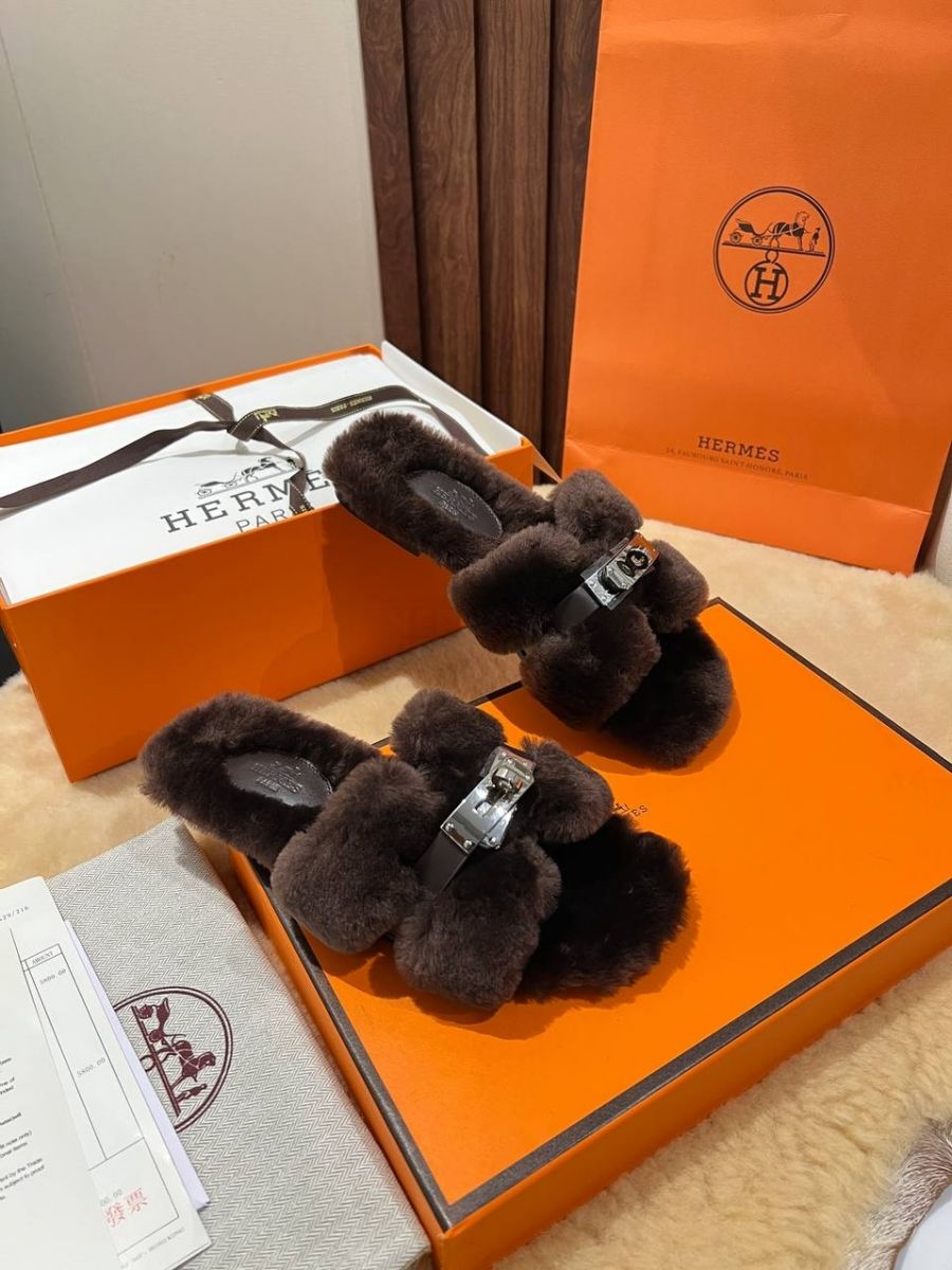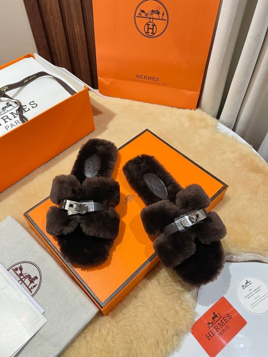 Женские меховые мюли шлепанцы HERMES Premium
